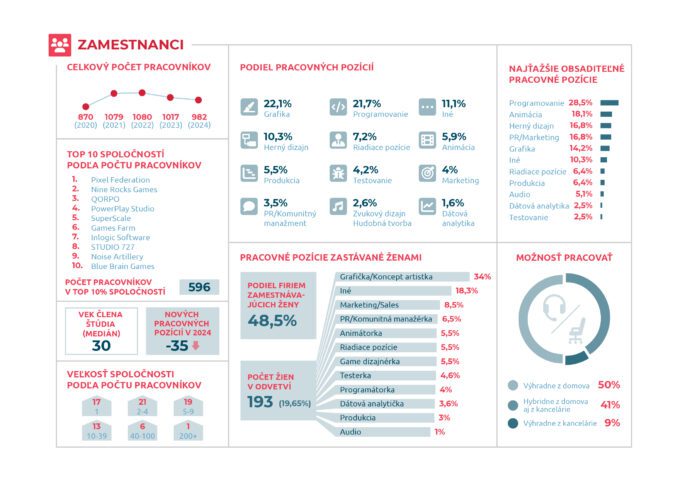 Spoločnosti v hernom priemysle zamestnávajú aktuálne 982 pracovníkov, z ktorých 19,65% tvoria ženy a 11,6% vývojári zo zahraničia. Medzi najžiadanejšie pracovné pozície patria programovanie, herný dizajn, tvorba grafiky a marketing, ktoré sú aj najťažšie obsaditeľné.