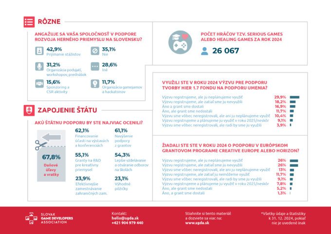 Cieľom občianskeho združenia Slovak Game Developers Association (SGDA) je formovanie atraktívneho prostredia a zlepšovanie podmienok pre vývoj hier na Slovensku, podpora herných vývojárov a herných startupov, vzdelávanie a rozvoj talentov a osveta odbornej i laickej verejnosti v oblasti tvorby digitálnych hier. Viac informácií nájdete na stránkach: www.sgda.sk
