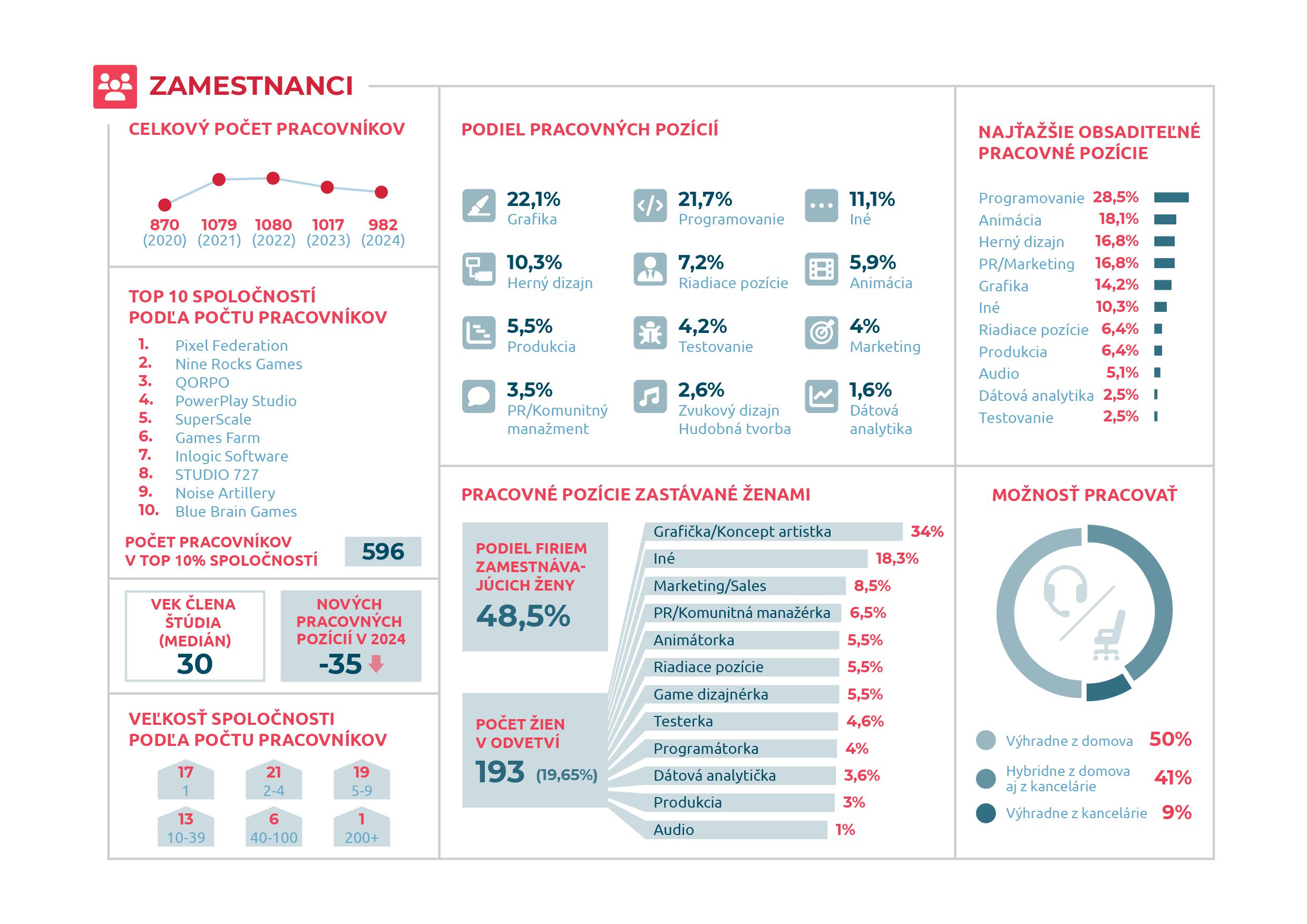 Spoločnosti v hernom priemysle zamestnávajú aktuálne 982 pracovníkov, z ktorých 19,65% tvoria ženy a 11,6% vývojári zo zahraničia. Medzi najžiadanejšie pracovné pozície patria programovanie, herný dizajn, tvorba grafiky a marketing, ktoré sú aj najťažšie obsaditeľné.