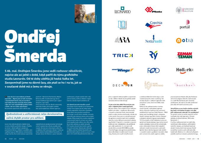 Na dalších stránkách se můžete začíst do zajímavého povídání uznávaného grafického designéra a dlouholetého pedagoga Ondřeje Šmerdy a připomenout si jeho známé, často dosud fungující značky (Národní muzeum, Nemocnice Na Homolce, Czechia atd.) i prohlédnout si jeho novější práce.