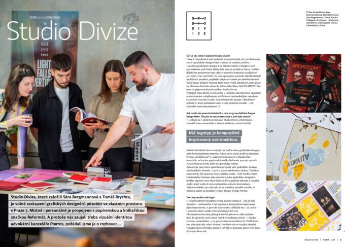 Úvodem vás čeká rozsáhlý rozhovor se Studiem Divize. Zakladatelé studia, Sára Bergmannová a Tomáš Brychta, poreferují nejen o svých začátcích a propojení s knihařskou dílnou Reformát, ale i o tom, jak vypadá dlohodobá spolupráce s mezinárodním workshopem dok.incubator, Vršovickým divadlem Mana či nověji s advokátními kancelářemi PORTOS, endors aj.